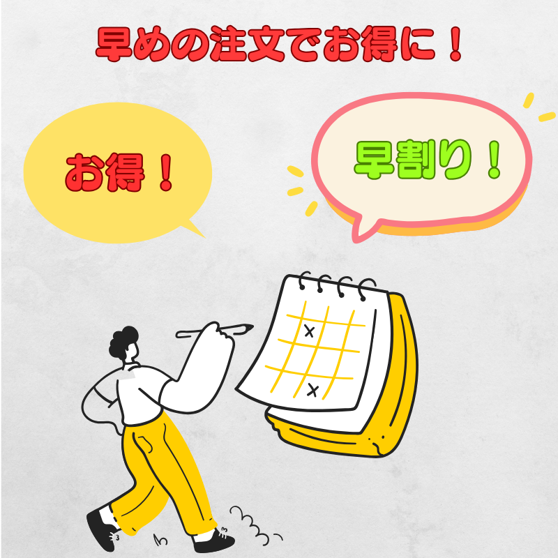 そして何よりうれしいのが、早割が今の時期(10月〜11月初旬)にスタートするということ。早めに注文するだけで、同じ内容でも数千円お得になることもあります。
