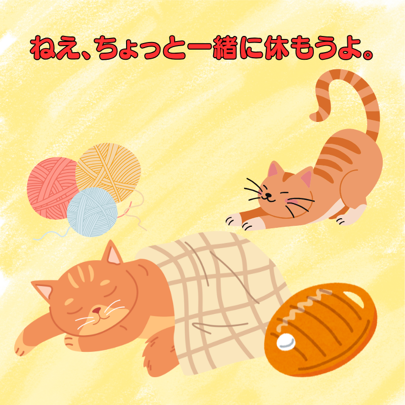 そんな慌ただしい空気の中でも、マイペースを崩さず、すやすや眠ったり、のんびり毛づくろいをしている猫達。その姿は、「ねえ、もう少しゆっくりでいいんじゃない?」とそっと囁いているようにも見えます。