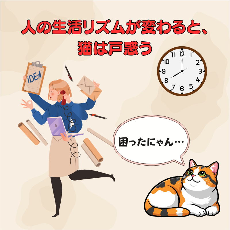 猫は環境の変化にとても敏感な動物。 こうした「ちょっとした違い」が重なることで、生活リズムがズレやすくなります。猫にしたらいい迷惑ですよね。