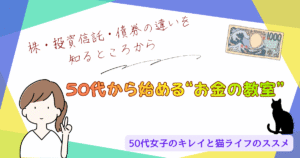資産形成や老後資金に不安を感じる50代女子向けに、株、投資信託、債券の基礎を少し深掘りしながら解説します。もう、ねこも、このテーマ苦手なんですが、苦手と言って逃げてはいられない崖っぷち。