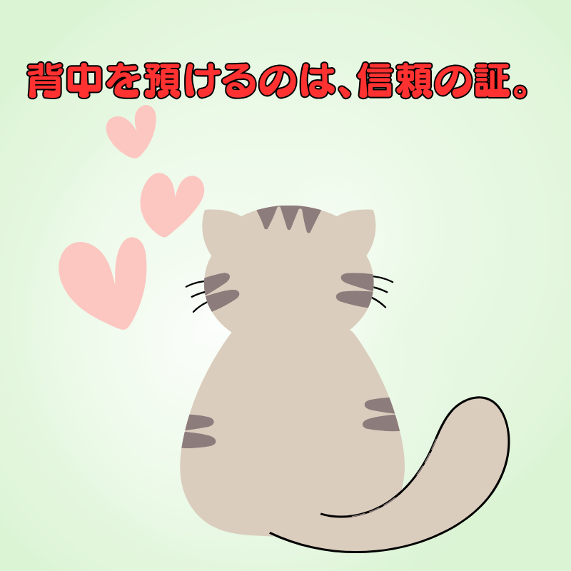 猫がお尻を向けてくるのは、失礼でも挑発でもなく「背中を預けている」サインです。猫は危険がある相手には背中を見せません。背中を向けられる相手は、猫にとって“警戒しなくていい存在”です。花ちゃんは、膝の上でも猫にお尻を向けているし、お布団の上で寝るときも、ねこにお尻を向けています。これは、「お前を信用して背後を預けるぜ!」みたいなもんですかね。