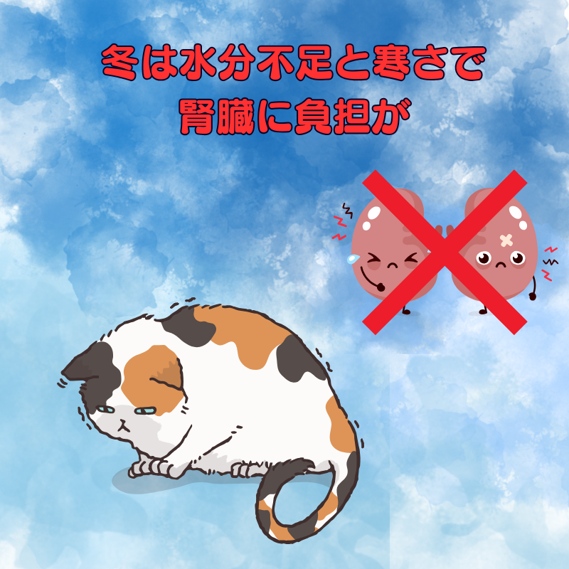 猫は人間よりもはるかに体温調節が苦手な動物。特に冬場は、急な温度変化が腎臓に負担をかけることが知られています。人間のねこですら、急に寒くなって体がついて行かない感じがしている今日この頃…寒さに弱い猫には大ダメージだと思います。