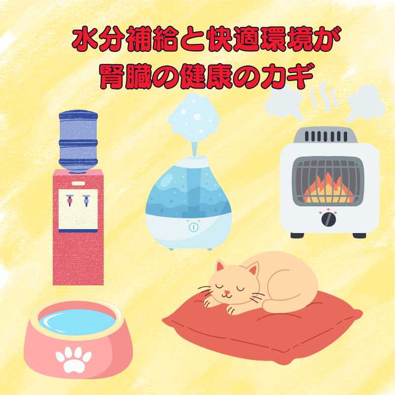猫の食欲が落ちたり、水をあまり飲まないようになったときは、腎臓のSOSサインかもしれません。普段から、水を飲んでいるか、寒くないか、脱水状態になっていないかチェックすることが大切ですね。