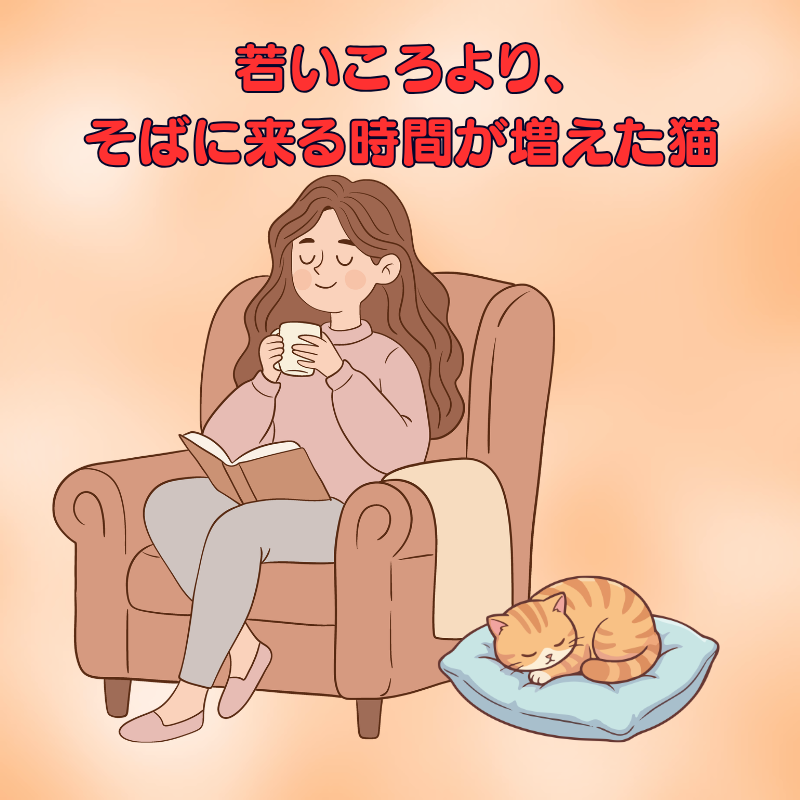 若いころは気ままに好きな場所で過ごしていた子が、シニアになると人の気配がある場所を選ぶようになることがあります。足元に座る、近くで眠る、何も言わずそっと同じ部屋にいる。そんな変化が増えてくると、「この子、前よりそばにいるな」と感じることもあります。