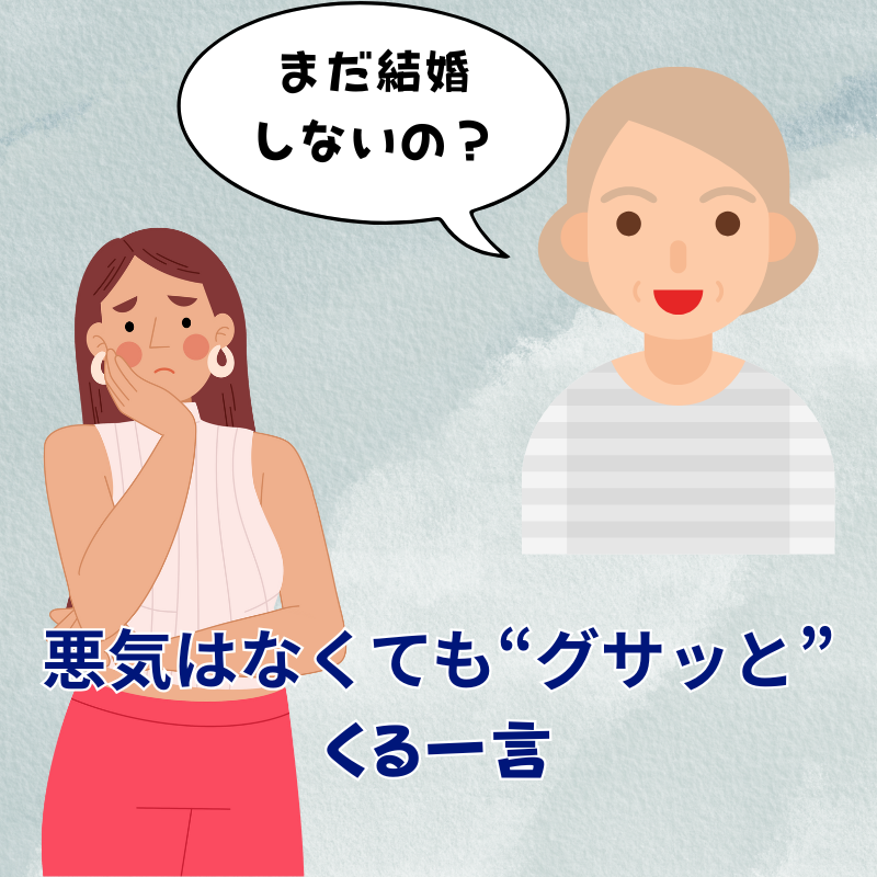 • 「まだ結婚しないの?」 → 定番の結婚ハラスメント。