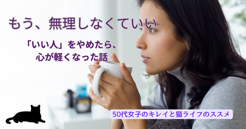 いい人でいるのをやめたら、心がふっと軽くなった 50代女子の人間関係、頑張りすぎない“手放し方”のコツ5つ こんにちは!ねこです。職場、家族、友人、ママ友、ご近所づきあい…。50代になると、人間関係の「数」は減ってきても、「疲れ」はなぜか増えるこ...